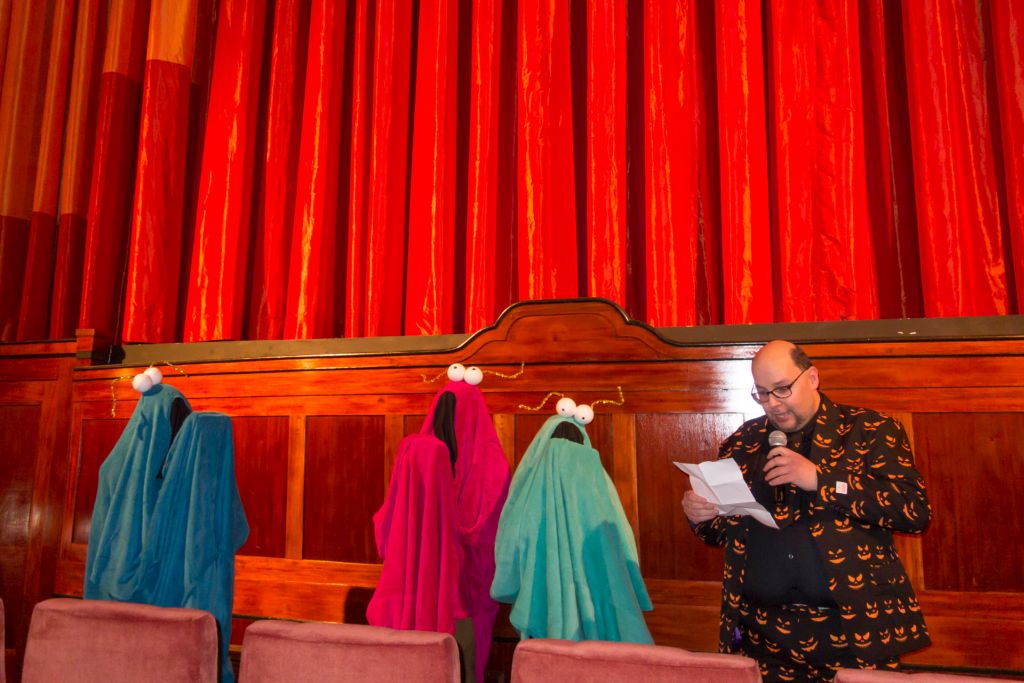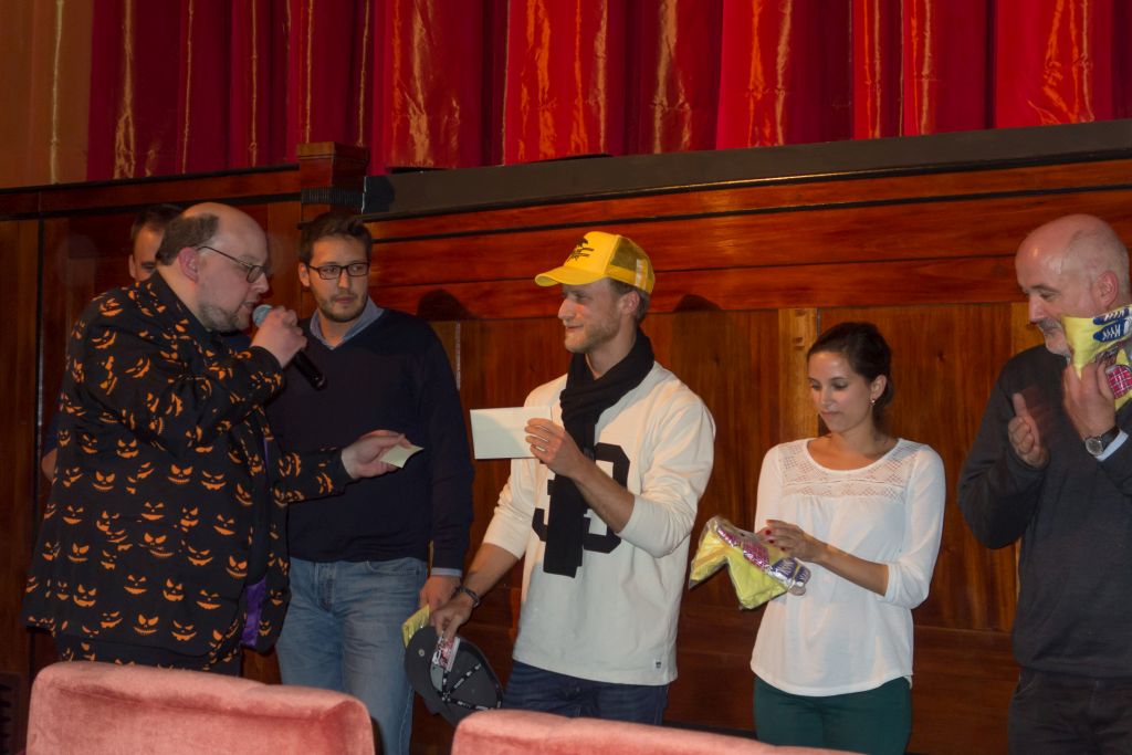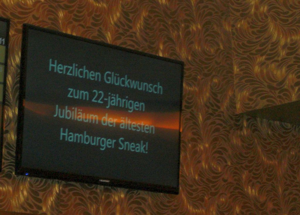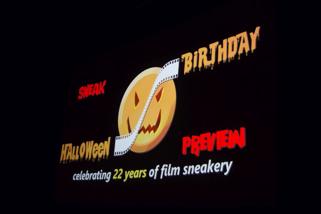 In diesem Jahr fiel der Geburtstag der Sneak - der Zweiundzwanzigste! - mal wieder direkt auf Halloween, was das Sneak-Team natürlich dazu nutzte, beides miteinander zu verbinden. So gab es Anzug und Kawatte, für manche auch Styroporaugen und Antennen; leider hielt sich die Beteilung des Publikums, was Verkleidungen angeht, wieder mal in engen Grenzen. Daher umso mehr Dank für die Unverzagten, die sich eine Maske oder eine anderes Halloween-Outfit aufgestzt bzw. angezogen hatten.