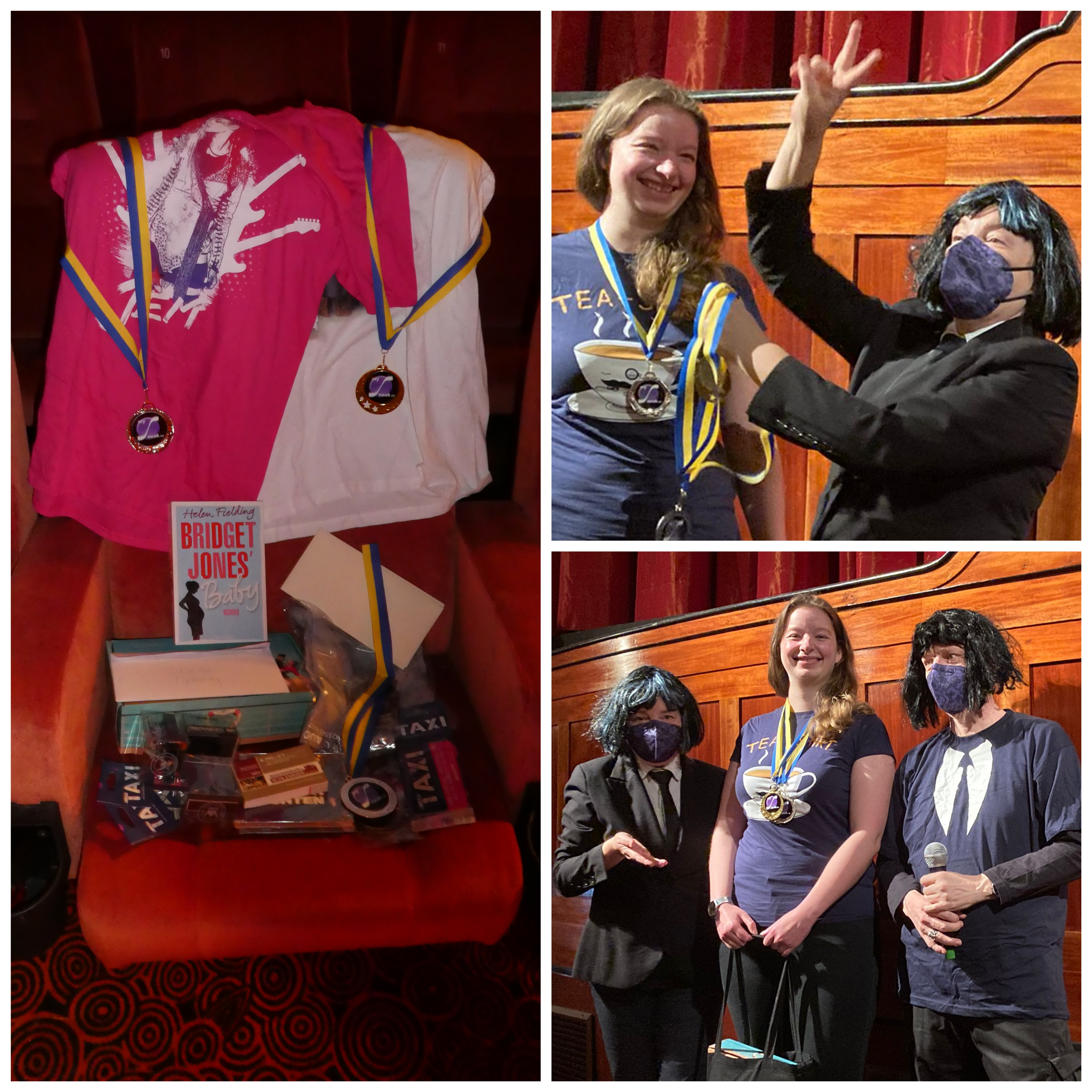 Nach den üblichen Begrüßung ging es dann einen kurzen Rückblick über drei Jahre Guess the Film!, denn unser Tipspiel ging natürlich auch in der Pandemie weiter; aufgrund der monatelangen Schließungen und nachfolgenden Beschränkungen kamen wir aber nicht dazu Tippkönige oder -königinnen zu krönen, weswegen zunächst noch einmal der winter 2019 sowie die Pandemie-Tipprunde 2020/2021 zusammengefaßt wurde, bevor es dann zur Ehrung der neuen Sommer-Tippkönigin 2022 ging. Der Zweit- und Drittplazierte konnten leider nicht erscheinen (Dauer-Gewinner ritter dickie bleibt Kinoveranstaltungen derzeit allgemein fern, und GuessWes ist vor ein paar Wochen aus Hamburg weggezogen, doch Letthesunshinein war zugegen und konnte sich über ein üpiges Preispaket (siehe Bild) sowie über gleich drei Medaillen freuen, denn selbstverständlich wurde sie nicht nur für ihren 1. Platz im Sommer 2022, sondern auch für die zweiten Plätze im Winter 2019 und in 2020/2021 ausgezeichnet.