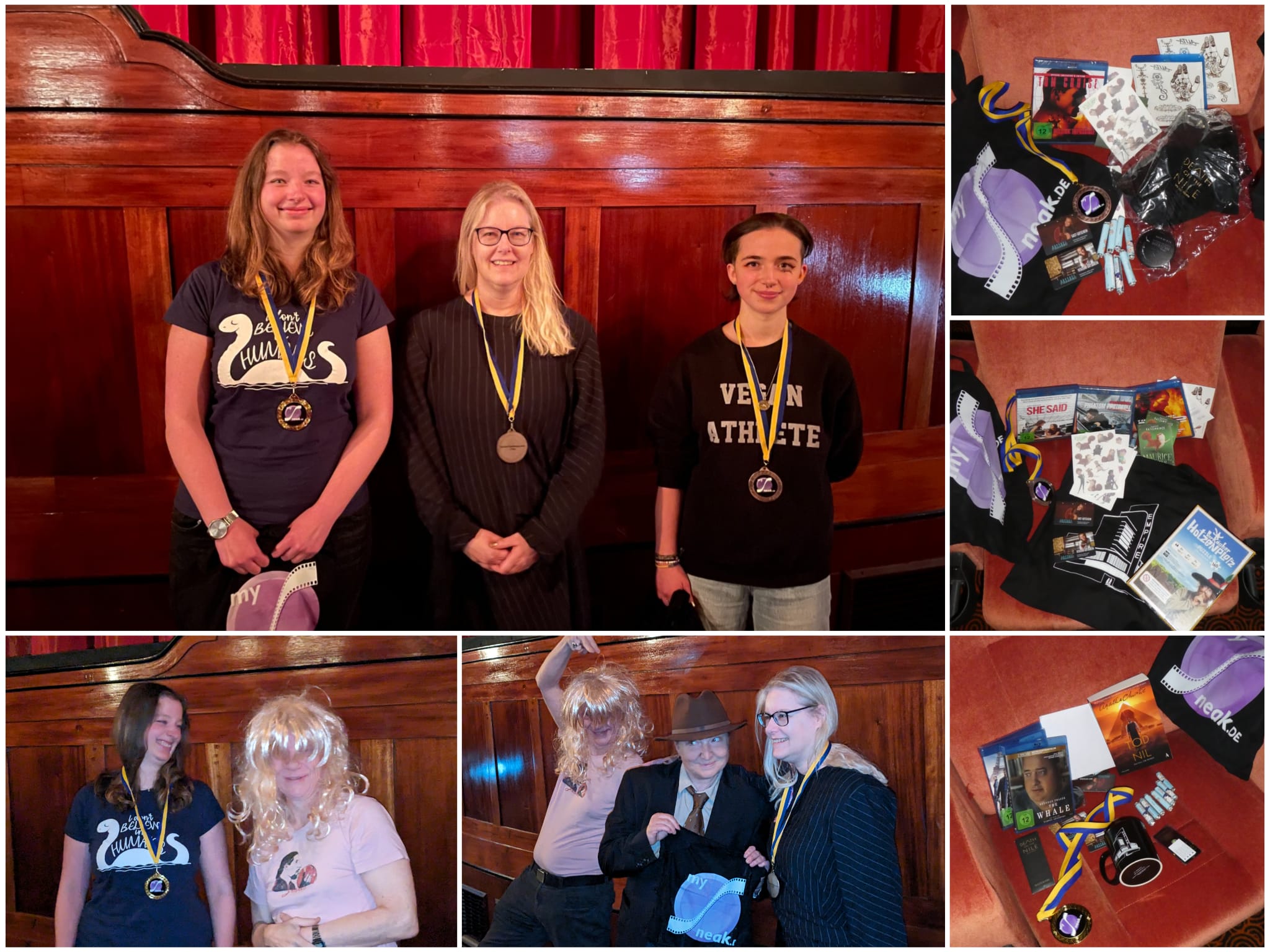 Von mir gab es dann ein paar kurze Highlights aus dem ersten Halbjahr 2023 des Guess the Film!-Tippspiels, das sich weiter erholt hatte. Mit etwa 38 Tipps pro Woche war das Vor-Corona-Beteiligungsniveau fast wieder erreicht, und trotz acht "Fahrkarten" (bei denen niemand richtig getippt hatte) stieg auch die Quote der richtigen Tipps leicht an. Die besten Mitspieler waren diesmal allesamt Mitspielerinnen. Zwei der drei Damen waren auch vor Ort zugegen, nur die Drittplazierte Mairim absolviert gerade ein Auslandssemester und wurde von Zoe (im Bild rechts)vertreten. Alle drei, also auch die Zweitplazierte Segel560 (Mitte) und Letthesunshinein (links), die ihren Titel verteidigen konnte und zur Sommer-Tippkönigin 2023 gekürt wurde, erhielten natürlich die traditionelle Medaille in Bronze, Silber oder Gold.